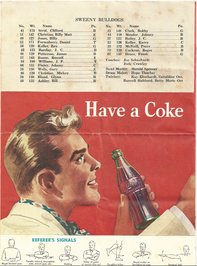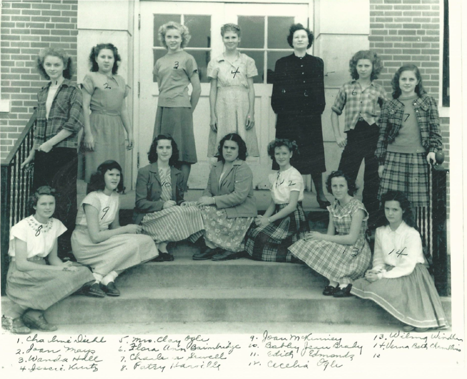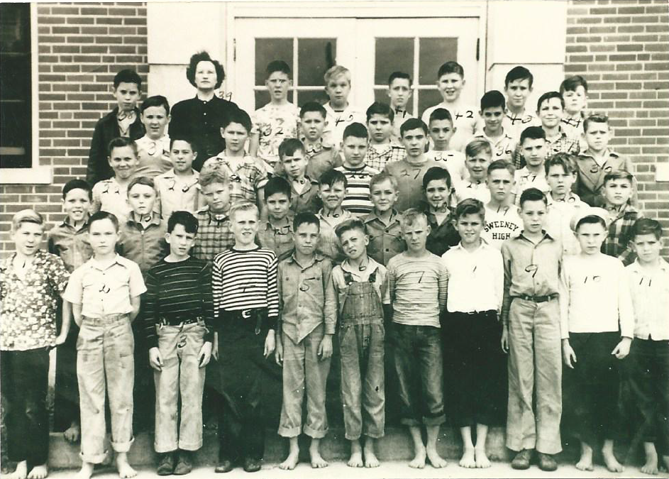 Around 1949, I believe; Cecelia Ogle Jones, whose mother was our teacher, could probably pinpoint the year pic was taken at front doors of Sweeny High School.